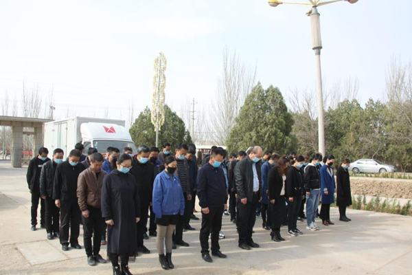 4月4日上午10时,雅盐化集团公司在办公楼门前举行哀悼活动,公司所有升国旗场所全部下半旗致哀,公司在家领导、中层管理人员及员工共50余人集体默哀三分钟,汽车鸣笛,为新冠肺炎疫情斗争牺牲烈士和逝世同胞哀悼,为生者祈福。集团公司工会主席张菊萍主持哀悼活动。