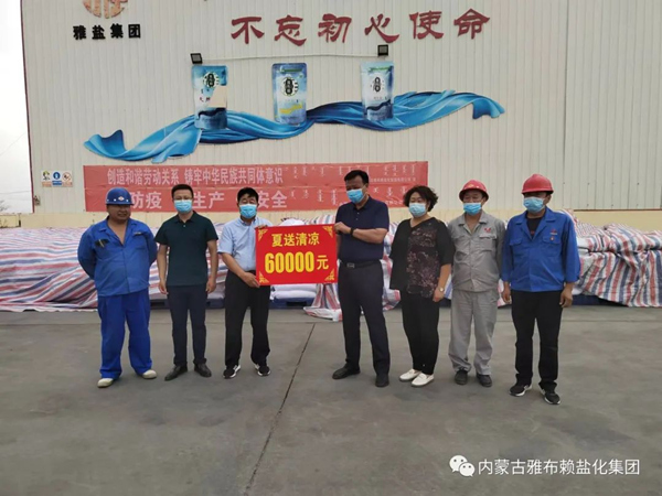 酷暑送清凉,慰问到一线。7月4日上午,盟人大工委党组成员、副主任、盟工会主席毕克在旗委副书记王东、旗总工会主席娜佈琪的陪同下到雅盐化集团公司开展“夏送清凉”慰问活动,为公司全体员工送上6万元防暑降温慰问金。公司党委书记、董事长李奎锦,工会主席张菊萍等相关领导接待。 公司党委书记、董事长李奎锦对盟工会的亲切关怀表示感谢。他表示,将切实抓紧抓好防暑降温工作,保障广大职工健康权益,确保企业安全稳定生产。